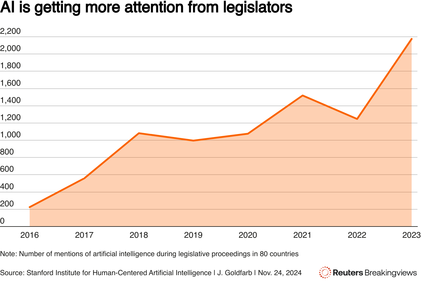 折线图显示了2016年至2023年期间80个国家在立法程序中提及人工智能的次数。
