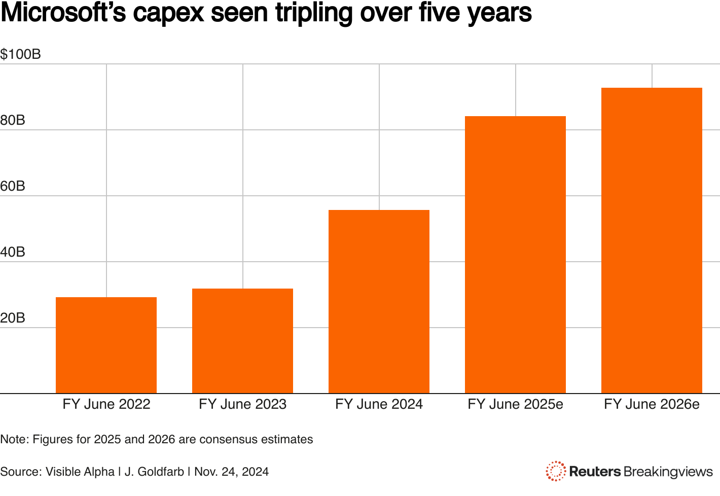 这些发展显然是一个挫折,但不应削弱我们的成就。从印度航空到苏黎世,成千上万的 客户通过使用Azure的云计算生成AI能力和Microsoft 365 Copilot改善和简化了他们的运营。在短短两年内,这些服务有望为我们 创造超过100亿美元的年收入,成为公司历史上最快达到这一里程碑的业务。这种增长有助于证明我们积极推动成为早期领导者的合理性。然而,我们也意识到需要从大量支出中获得健康的投资回报。到2024年9月的六个季度内,我们的资本支出比前六个季度多出430亿美元。随着这一类别的扩展,从14%占收入的30%,这被解读为大约360亿美元用于人工智能。根据Visible Alpha,华尔街的朋友们去年预计微软到2026年6月的财年结束时将投入大约900亿美元用于资本支出,是五年前的三倍。仔细检查我们的收入报表也会得出合理的推断,即一些运营费用也被重新分配给了人工智能。