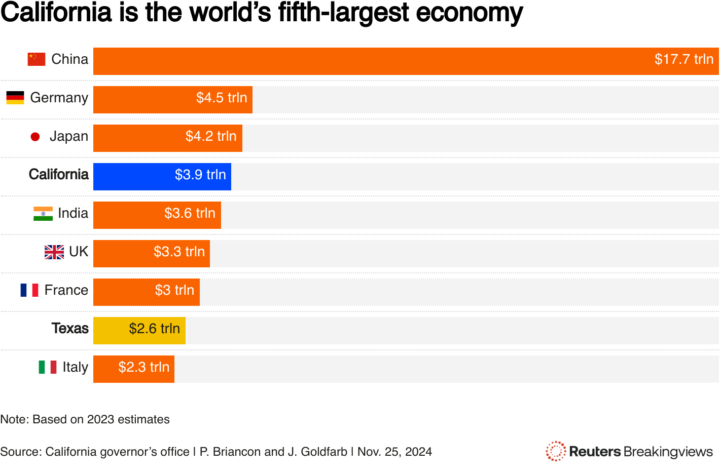 美国和加利福尼亚州的旗帜在加利福尼亚州海洋边的旗杆上共同飘扬,时间是2017年10月24日。路透社/迈克·布莱克纽约,12月20日(路透社Breakingviews)- 企业分拆正成为潮流,一个国家的分拆也将很快加入其中。尽管科技亿万富翁对唐纳德·特朗普的支持非常 vocal 和财务上,但他在加利福尼亚州的选票中获得的支持率不到40%。民主党州长加文·纽瑟姆已经呼吁州立法机构“保护加利福尼亚的价值观和基本权利”,以抵御当选总统的第二个任期。这样的抵抗似乎注定将在2025年升级为一个分裂运动。像通用电气和杜邦一样,加利福尼亚州拥有考虑分裂的财务实力。到2023年,黄金州的经济达到3.9万亿美元,占美国GDP的14%,在全球排名第五,超过印度、英国和法国。其居民也是最大的净贡献者。向联邦财政贡献,2022年支付的金额比收到的多出720亿美元,根据洛克菲勒政府研究所的报告。