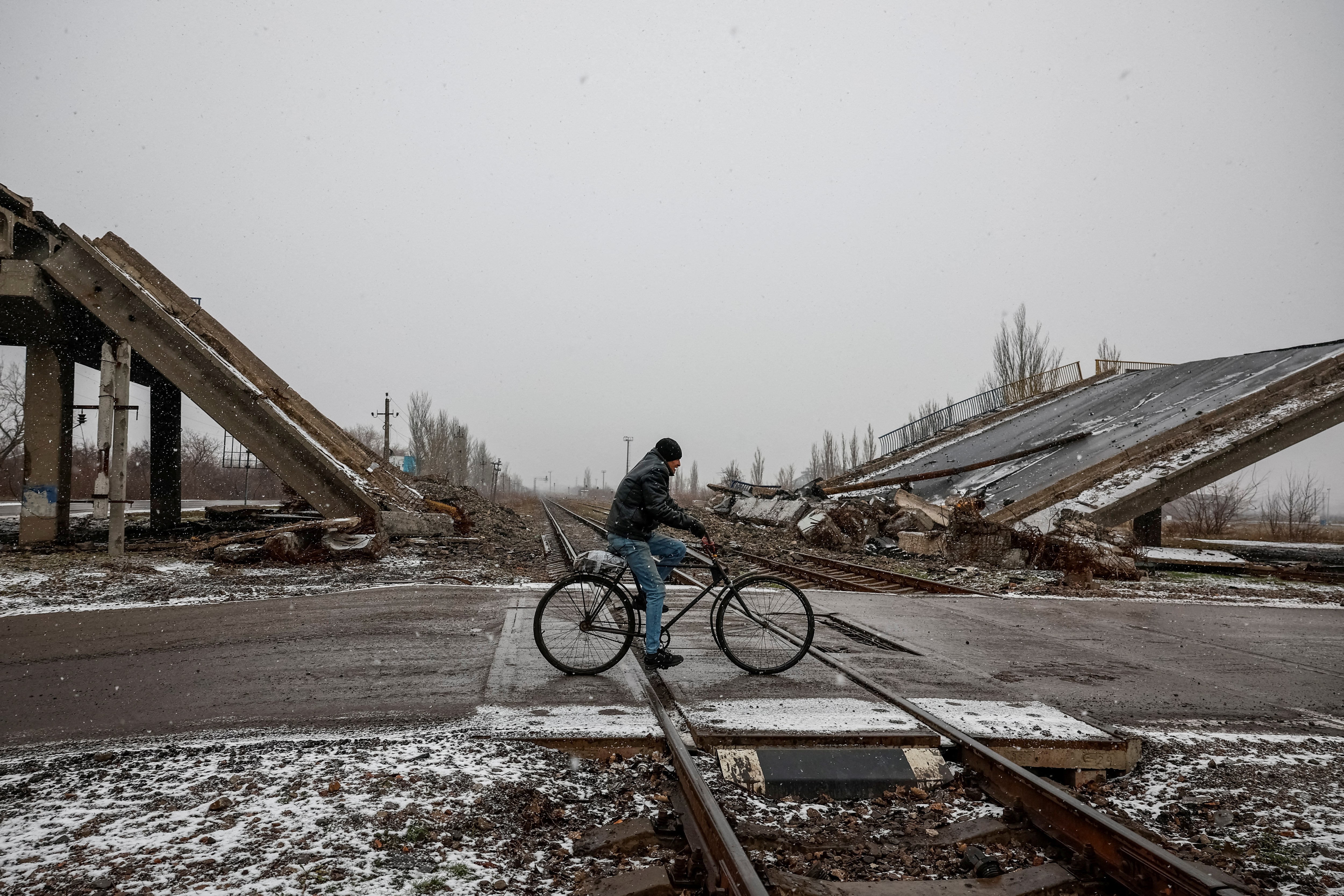 一名居民在2024年12月19日乌克兰东部一座被俄罗斯攻击摧毁的桥附近骑自行车。摄影:埃琳娜·斯穆特科 - 路透社基辅2024年12月20日(路透社) - 乌克兰军方今天星期五表示,其部队已从顿涅茨克地区的奥斯平尼夫卡和特鲁多夫村附近撤退,以避免被推进的俄罗斯军队包围。