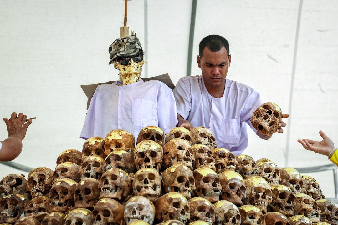 第1项,共38项 一名志愿者在泰国那空叻差斯马府的Sawang Metta Thammasathan基金会的Lang Pa Cha大规模清洗仪式上,将金箔放在一具人类头骨上,时间是2024年6月1日。随着火化日的临近,志愿者们使用牙刷和圣水轻轻清洗遗骸上的泥土,然后用金箔装饰它们。装饰好的遗骸随后被安排在两个不同的火堆中——一个为男性,一个为女性。 REUTERS/Athit Perawongmetha