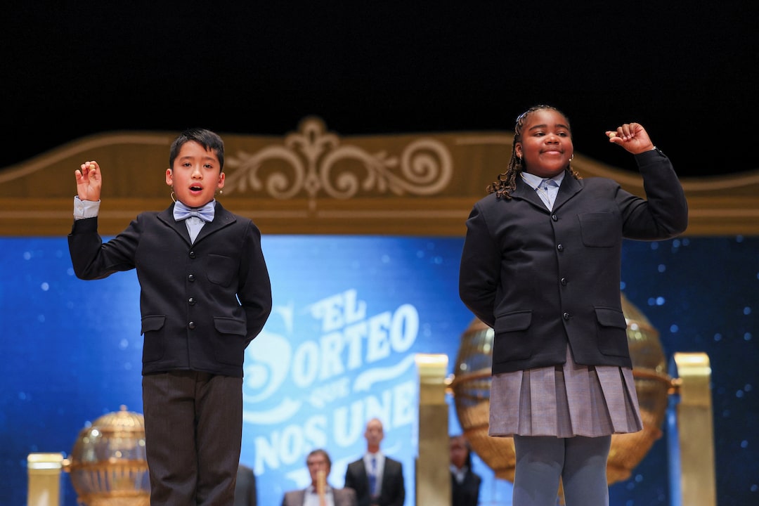 在马德里的皇家剧院进行的全国电视直播抽奖中,圣伊尔德丰索学校的年轻学生从两个旋转的地球仪中抽取中奖号码并唱出。