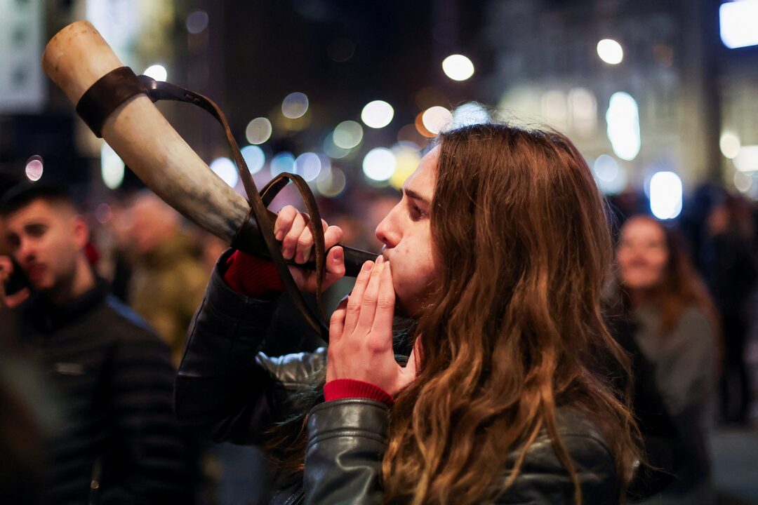 第1项,共5项 人们在贝尔格莱德参加抗议活动,反对政府政策、腐败和他们指责导致11月诺维萨德火车站灾难中受害者死亡的疏忽,日期为2024年12月22日。路透社/Djordje Kojadinovic