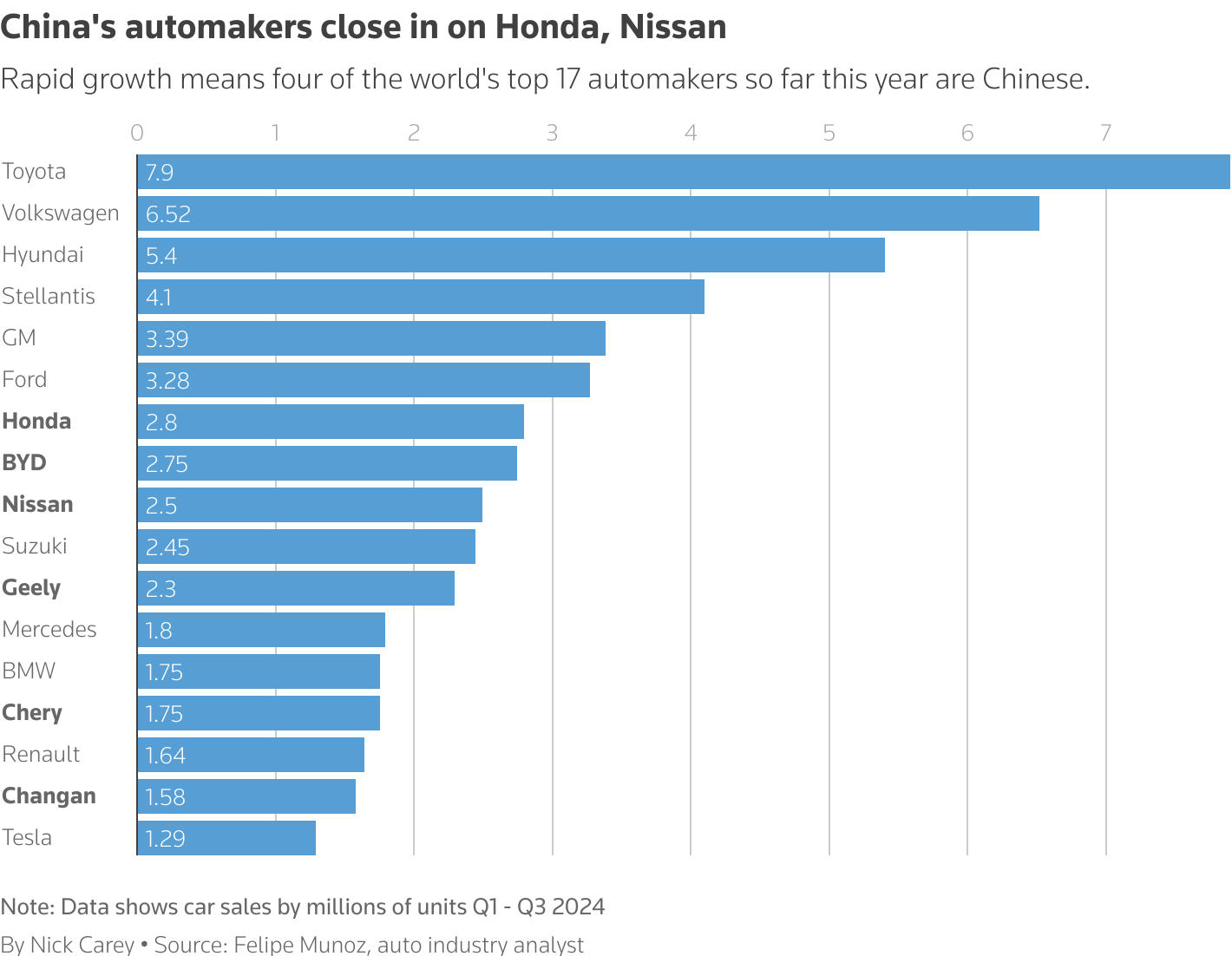 截至九月的全球汽车销售数据显示,世界前17大汽车制造商中有四家是中国公司。