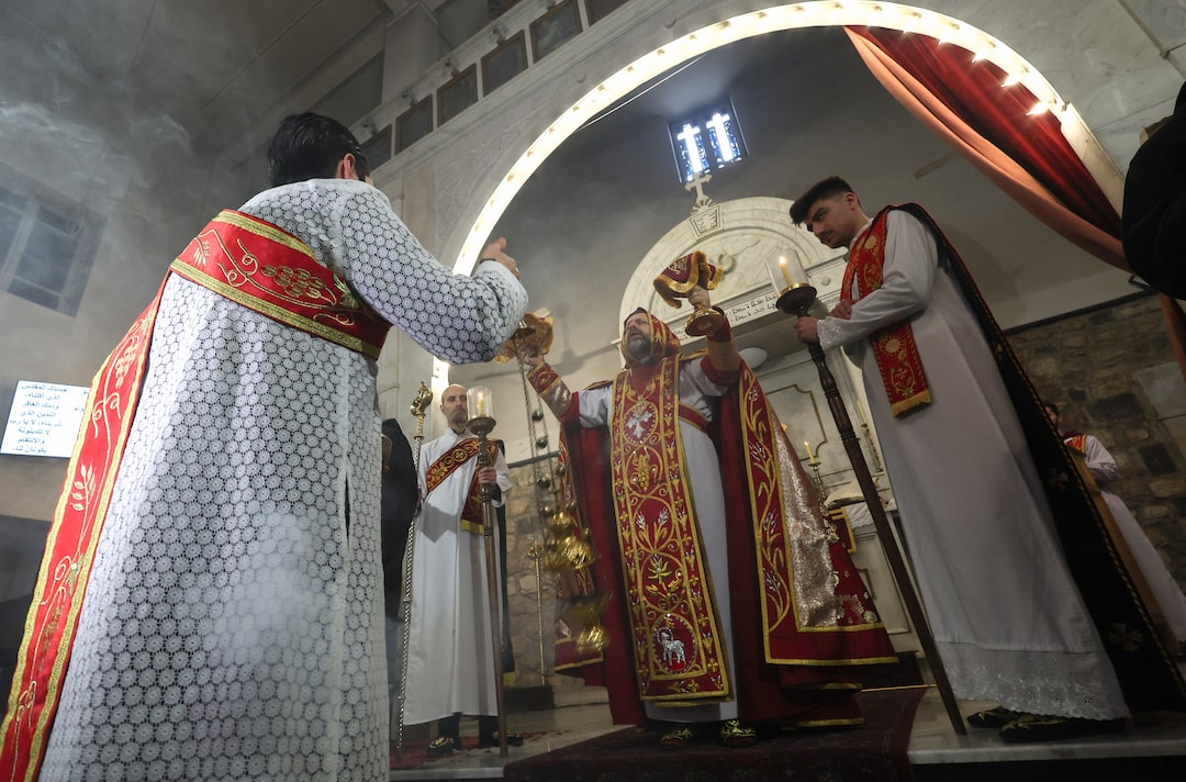 第1项,共4项 主教安德鲁·巴希在大马士革老城的圣乔治叙利亚正教会参加周日早晨的弥撒,叙利亚总统巴沙尔·阿萨德被驱逐后,时间为2024年12月22日。路透社/阿姆尔·阿卜杜拉·达尔什