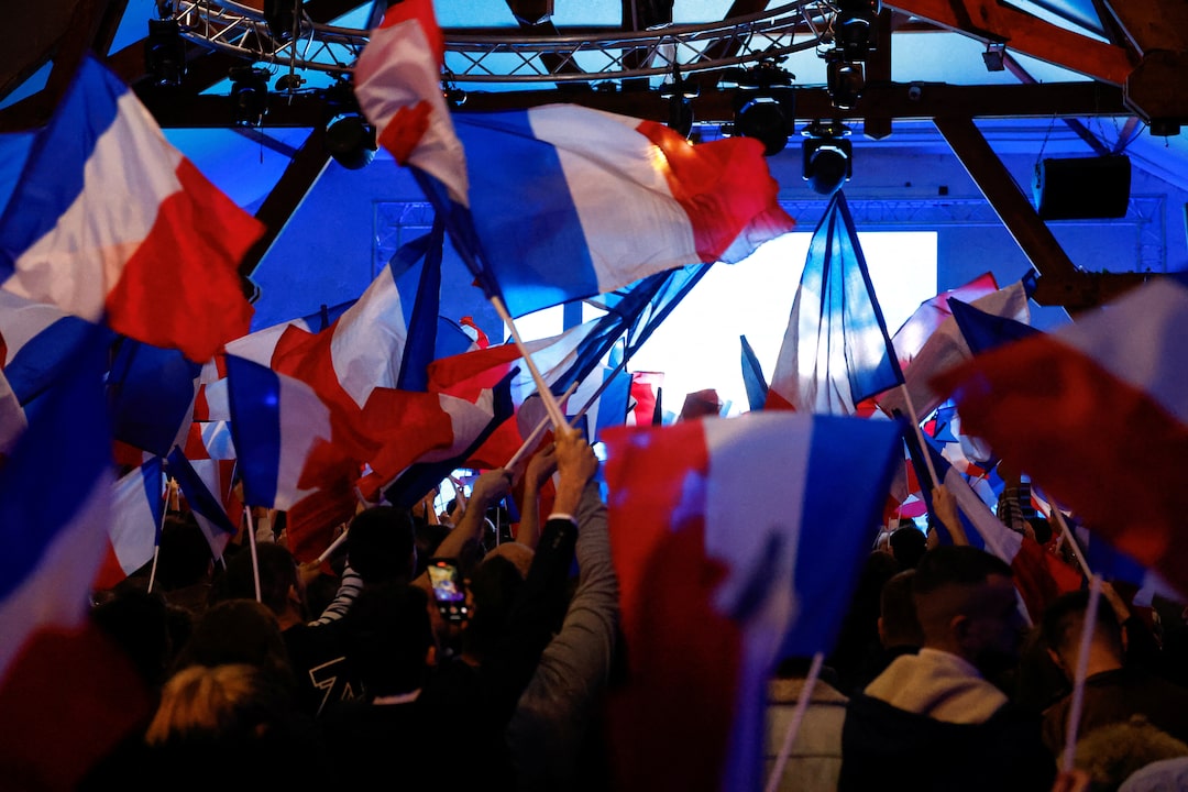 第1项,共4项 法国极右翼国民阵线(Rassemblement National - RN)党派的支持者在法国埃特拉帕尼的政治集会上挥舞法国国旗,2024年12月15日。路透社/斯蒂芬妮·勒科克/档案照片