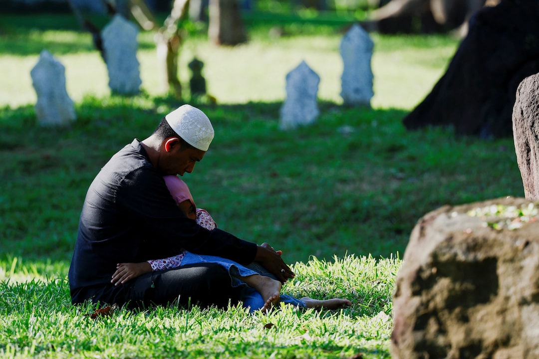 第1项,共5项 一名穆斯林男子在乌勒赫乌大规模坟墓前安慰他的女儿,他们在这里为2004年印度洋海啸的受害者祈祷,纪念印度洋海啸20周年,地点在印尼亚齐省的班达亚齐,2024年12月26日。路透社/威利·库尔尼亚万