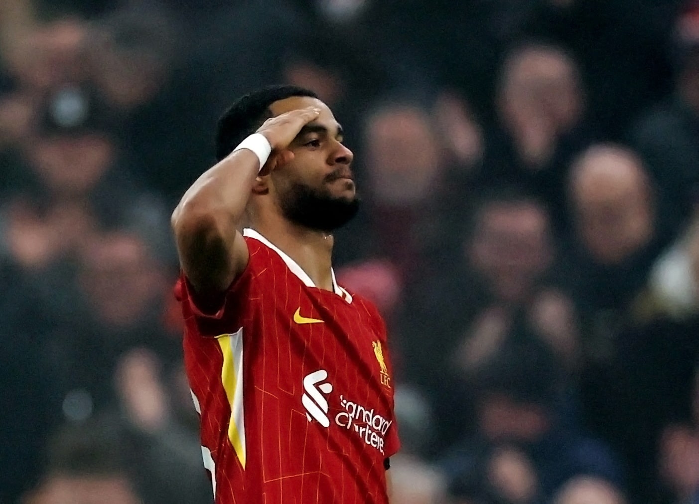 科迪·雅克波在2024年12月26日的英超联赛中,利物浦对阵莱斯特城的比赛中进球后庆祝。摄影:大卫·克莱因 - 路透社(该图片仅用于编辑目的)利物浦(英格兰)2024年12月26日(阿拉伯路透社体育服务) - 利物浦在周四的安菲尔德球场将早期落后的局面逆转,以3-1战胜来访的莱斯特城,领先英超联赛积分榜七分。