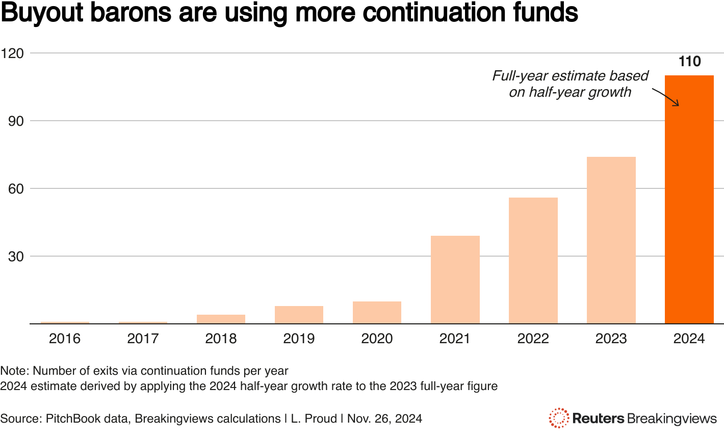 这种销售的最流行机制是继续基金,私募股权交易商可以将特定资产转移到这些特殊工具中。它们通常被宣传为管理者保留奖杯业务的一种方式,同时允许一些旧投资者通过引入新资本来兑现。BC Partners展示了它们也可以给问题企业时间进行自我改造:它在2021年为学术出版商Springer Nature使用了一个继续基金。(SPGG.DE),它在偿还债务后于2024年最终上市。
