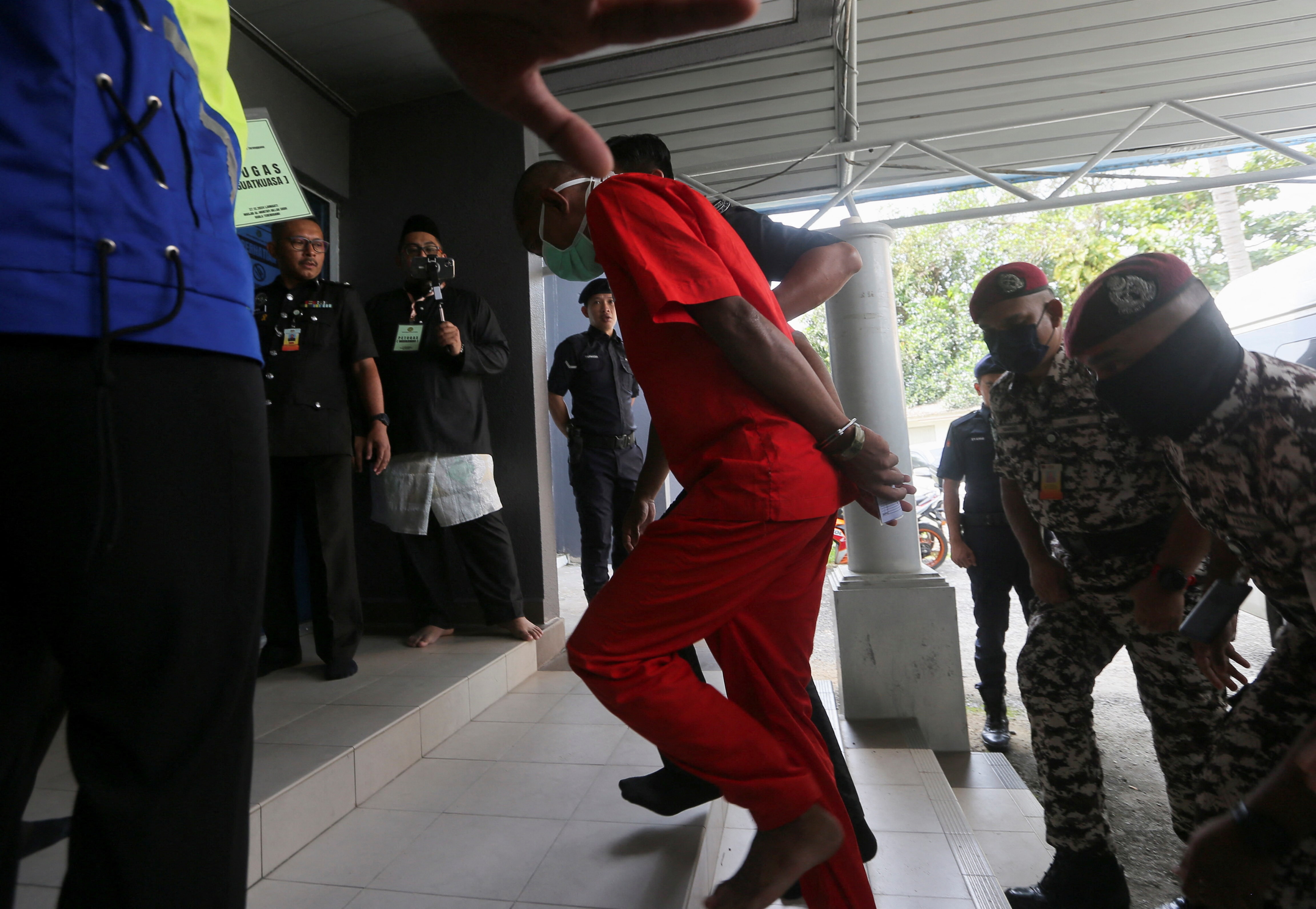 穆罕默德·阿芬迪·阿旺,一位42岁的五个孩子的父亲,被监狱警卫护送到清真寺接受公开鞭刑,因为他在马来西亚吉兰丹州的瓜拉登嘉楼因“亲密接触”这一伊斯兰罪行被多次定罪,时间是2024年12月27日。路透社/记者吉隆坡,12月27日 - 据当地媒体报道,一名马来西亚男子因与非家庭成员的异性亲密接触在东北部的登嘉楼州的一座清真寺被鞭刑,这在当地是一次罕见的公开判决。