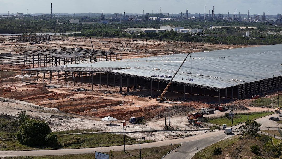 第1项,共2项 无人机视角显示比亚迪新电动车(EV)工厂的建设现场,位于巴西卡马卡里,2024年12月26日。路透社/乔·苏扎