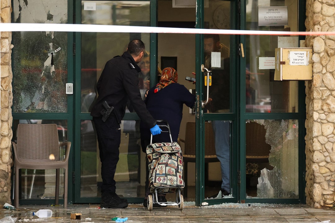 第1项,共5项 一名以色列警察在以色列赫兹利亚附近的疑似袭击现场帮助一名女性进入建筑,2024年12月27日。路透社/凯·法芬巴赫
