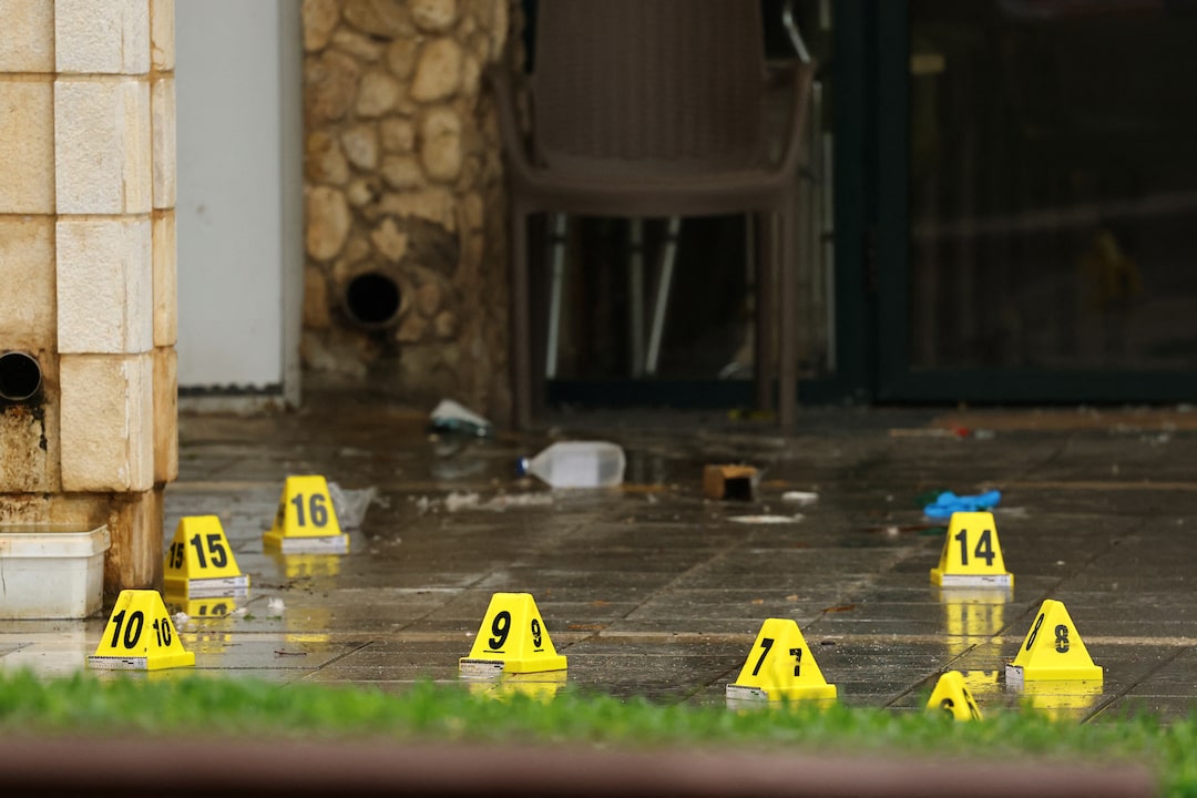 第1项,共5项 一名以色列警察在以色列赫兹利亚附近的疑似袭击现场帮助一名女性进入建筑,2024年12月27日。路透社/凯·法芬巴赫