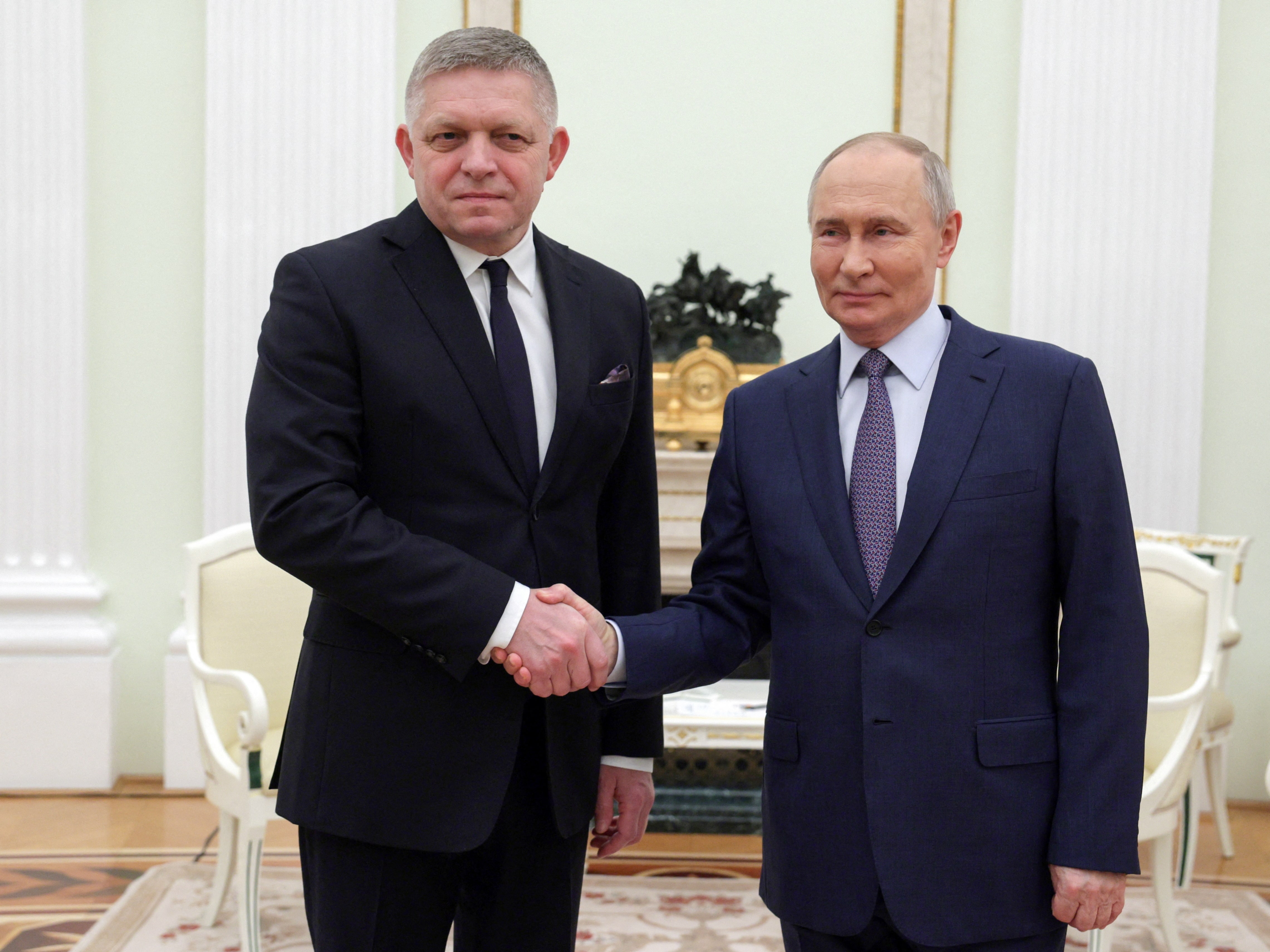 俄罗斯总统弗拉基米尔·普京在2024年12月22日于克里姆林宫与斯洛伐克总理罗伯特·菲佐会晤时握手。路透社的照片由新闻机构代表提供。布拉格2024年12月29日(路透社) - 斯洛伐克拒绝了乌克兰总统弗拉基米尔·泽连斯基对总理罗伯特·菲佐的指控,称其在俄罗斯的命令下对基辅开启“能源战线”,此时两国之间的天然气运输争端加剧。
