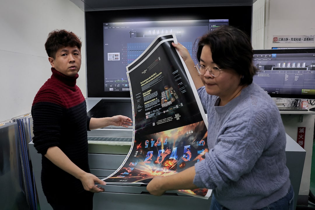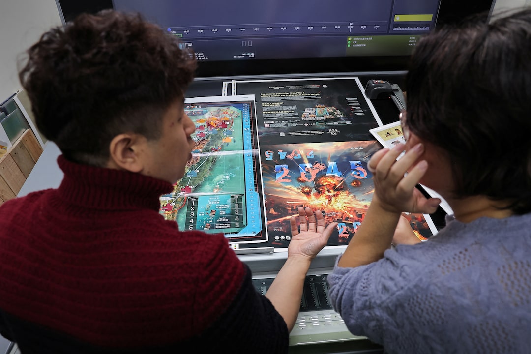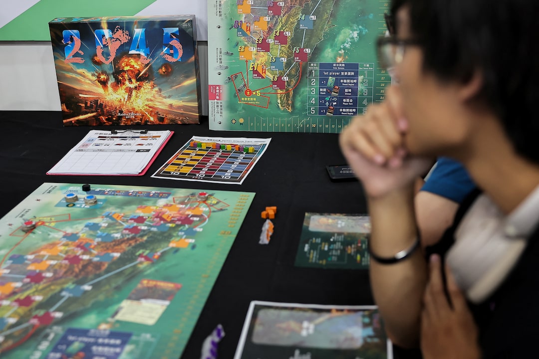 5名玩家测试“Mizo Games”推出的新桌游“2045”,该游戏以台湾周边的武装冲突为背景,地点在2024年9月22日的台北。路透社/安王