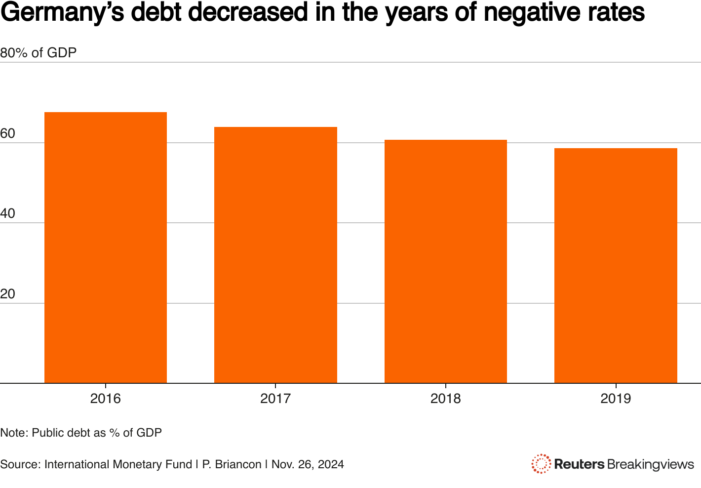 一张柱状图显示德国公共债务占GDP的百分比