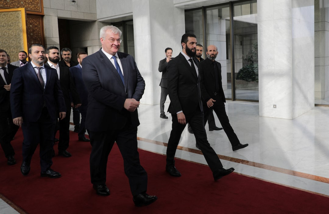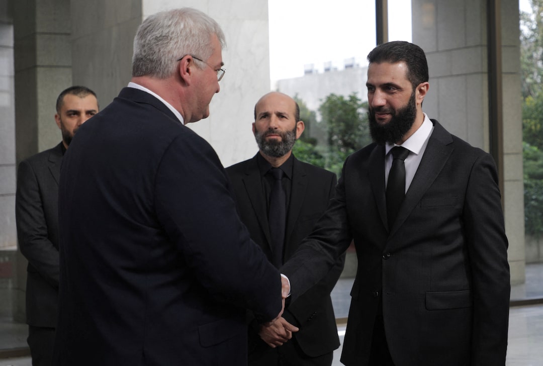 叙利亚事实上的领导人艾哈迈德·阿尔-沙拉(Ahmed al-Sharaa),也被称为阿布·穆罕默德·阿尔-戈拉尼(Abu Mohammed al-Golani),在大马士革与由乌克兰外长安德烈·西比哈(Andrii Sybiha)领导的高级乌克兰代表团会晤时注视着他们,此次会晤是在叙利亚巴沙尔·阿萨德(Bashar al-Assad)被驱逐后进行的,时间为2024年12月30日。路透社/哈利尔·阿沙维(REUTERS/Khalil Ashawi)