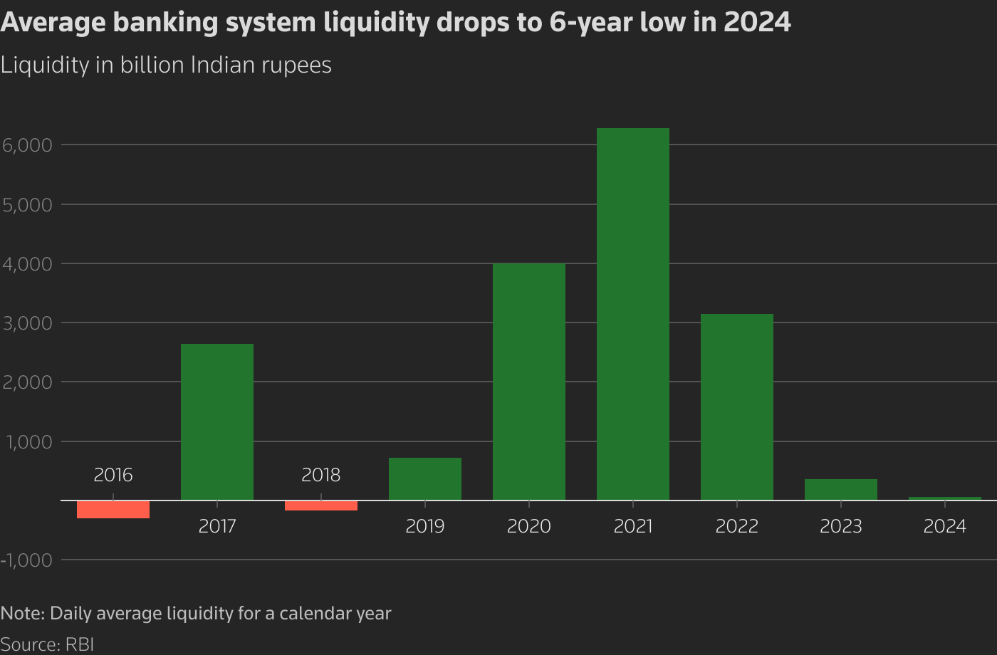 由于中央银行专注于通胀管理并对现金条件保持严格控制,2024年平均银行系统流动性转为中性。过去两年平均流动性处于盈余状态。