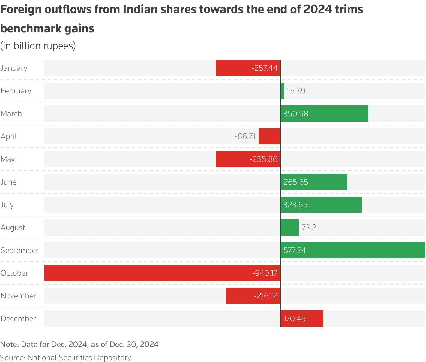 印度基准指数在2024年表现不及主要同行,盈利前景黯淡,外资流出施压 | 路透社