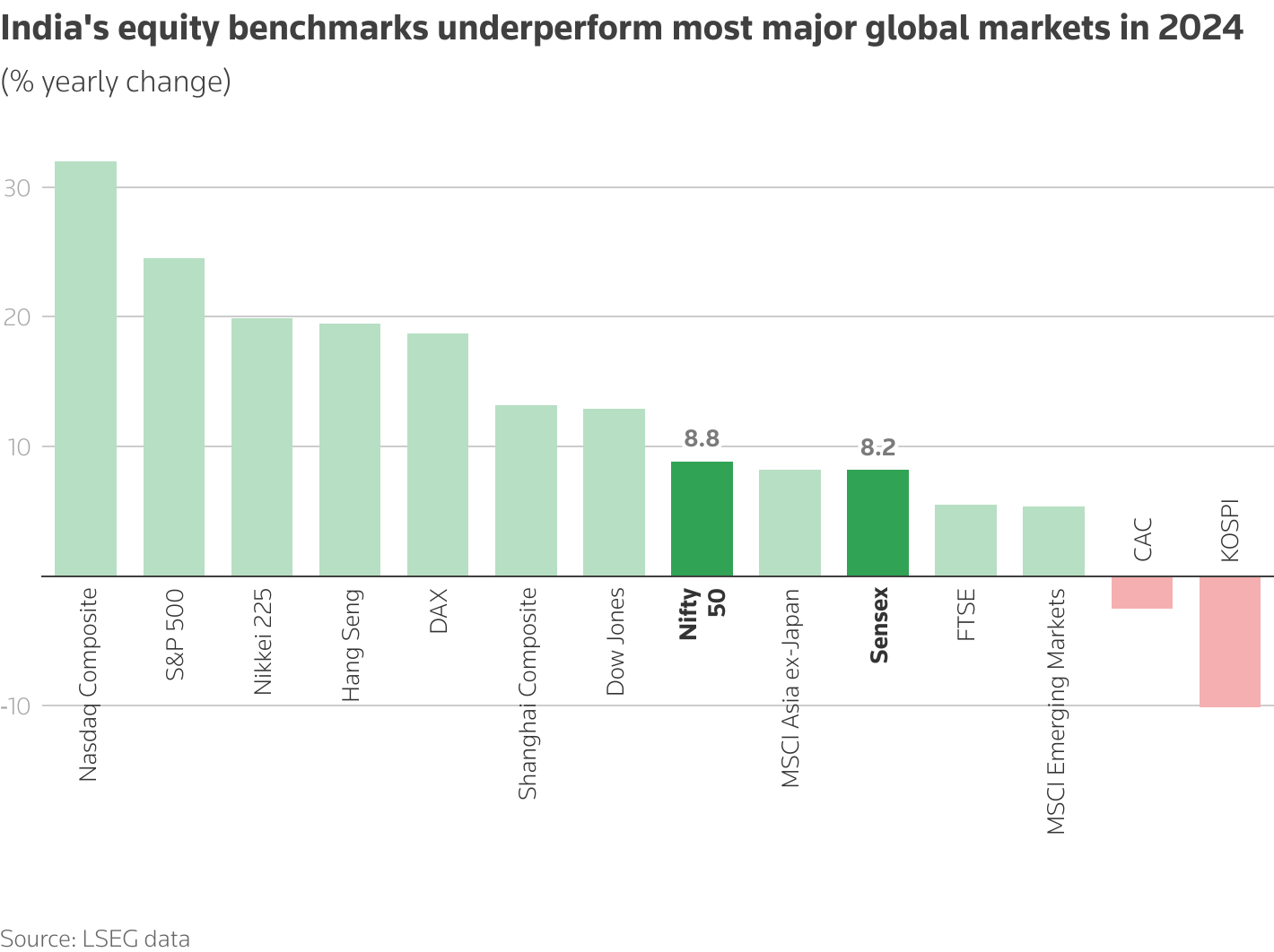 印度的股票基准在2024年表现不及大多数主要全球市场
