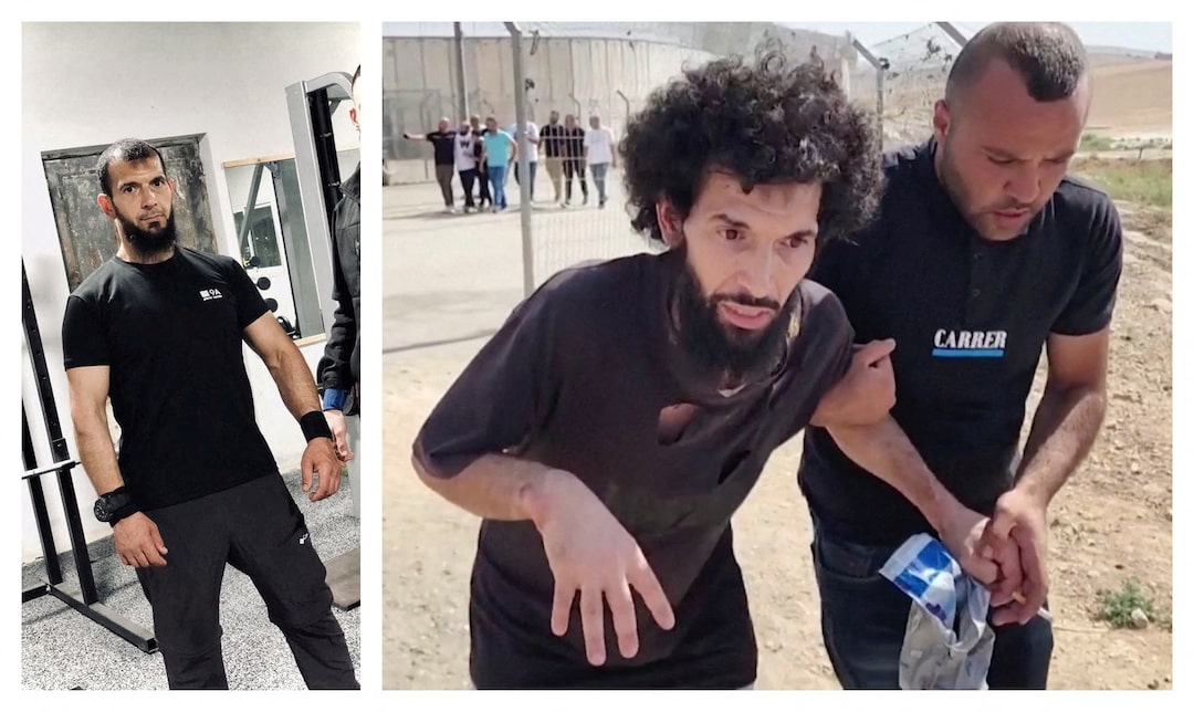 第1项,共6项 一张合成图显示巴勒斯坦人Moazaz Obaiyat在一张未注明日期的照片中训练于健身房,逮捕前在伯利恒附近,以及Obaiyat在视频截图中走路的样子,刚从以色列监狱释放,位于以色列占领的希伯伦附近,2024年7月8日。萨达姆·奥拜亚特/提供和路透社电视/档案照片