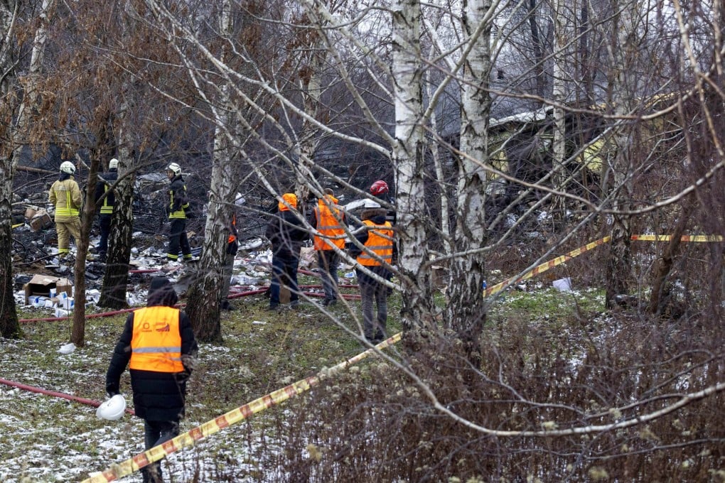 11月26日,立陶宛维尔纽斯附近,一架DHL货机坠入民宅,调查人员现场工作时警方封锁了道路。美联社照片