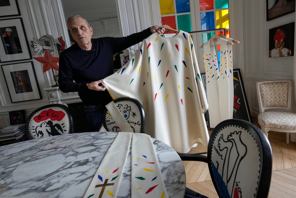 让-夏尔·德·卡斯泰尔巴雅克展示为巴黎圣母院重开设计的祭服。他将服装上汇聚的彩色碎片比作圣母院的重生。美联社照片