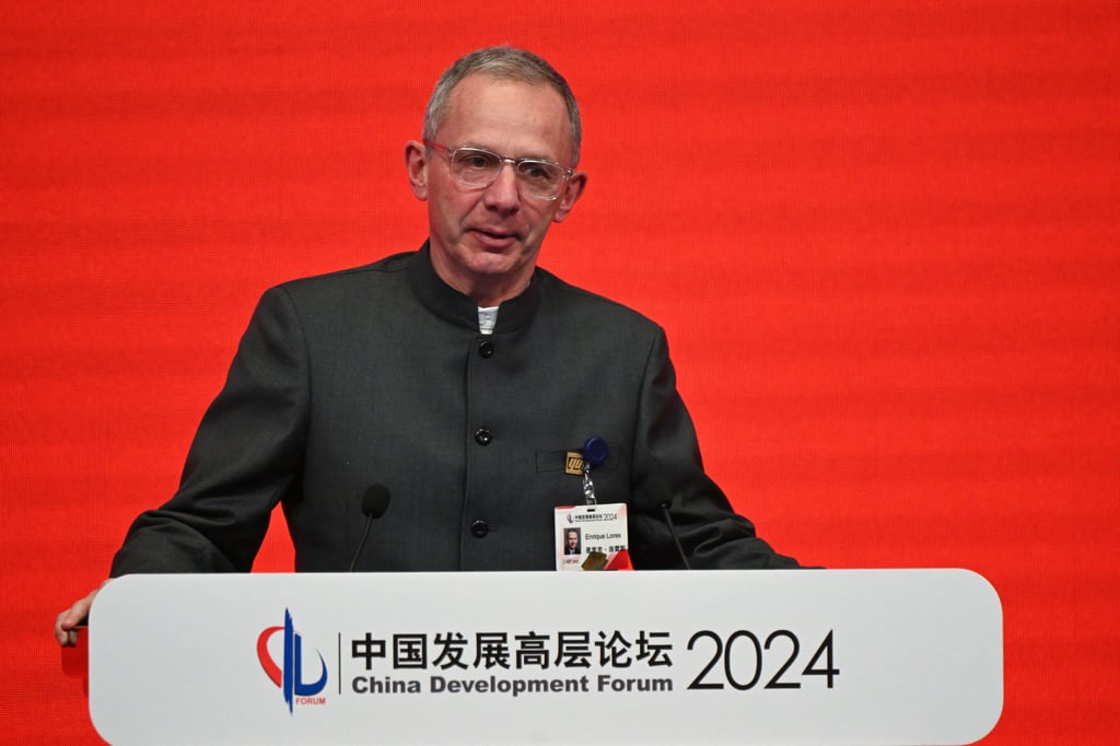 2024年3月25日,惠普总裁兼首席执行官恩里克·洛雷斯在北京中国发展论坛上发表讲话。洛雷斯表示微软最新版Windows系统对企业客户PC销售的促进作用不及前几代系统迅速。照片:法新社