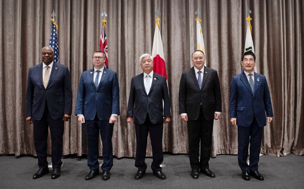 (从左至右)美国国防部长劳埃德·奥斯汀、澳大利亚的帕特·康罗伊、日本的中谷元、菲律宾的小吉尔伯托·特奥多罗和韩国的金永贤,11月21日于老挝万象。照片:韩国国防部通过美联社提供