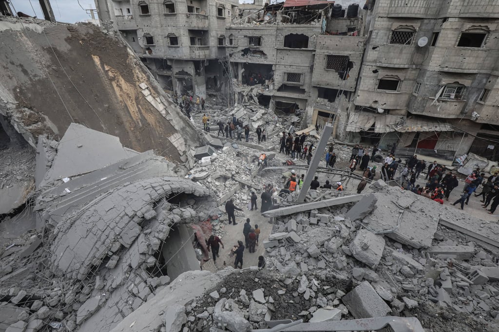 巴勒斯坦民众检查加沙中部卡桑清真寺及周边建筑。图片来源:德新社