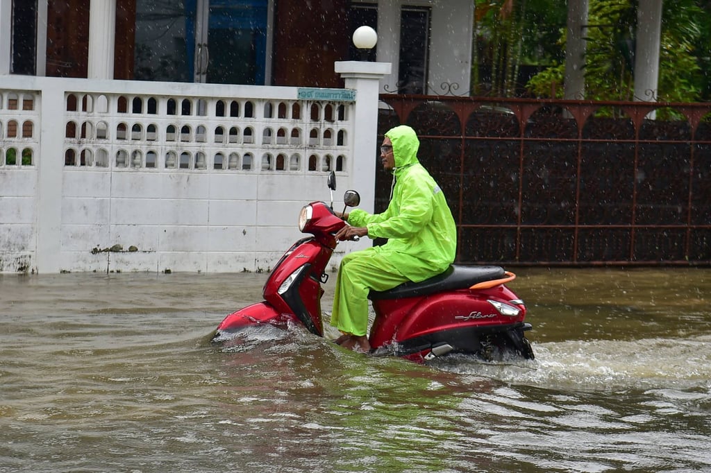 11月27日,泰国南部那拉提瓦府暴雨后,一名摩托车手涉水骑行。法新社摄
