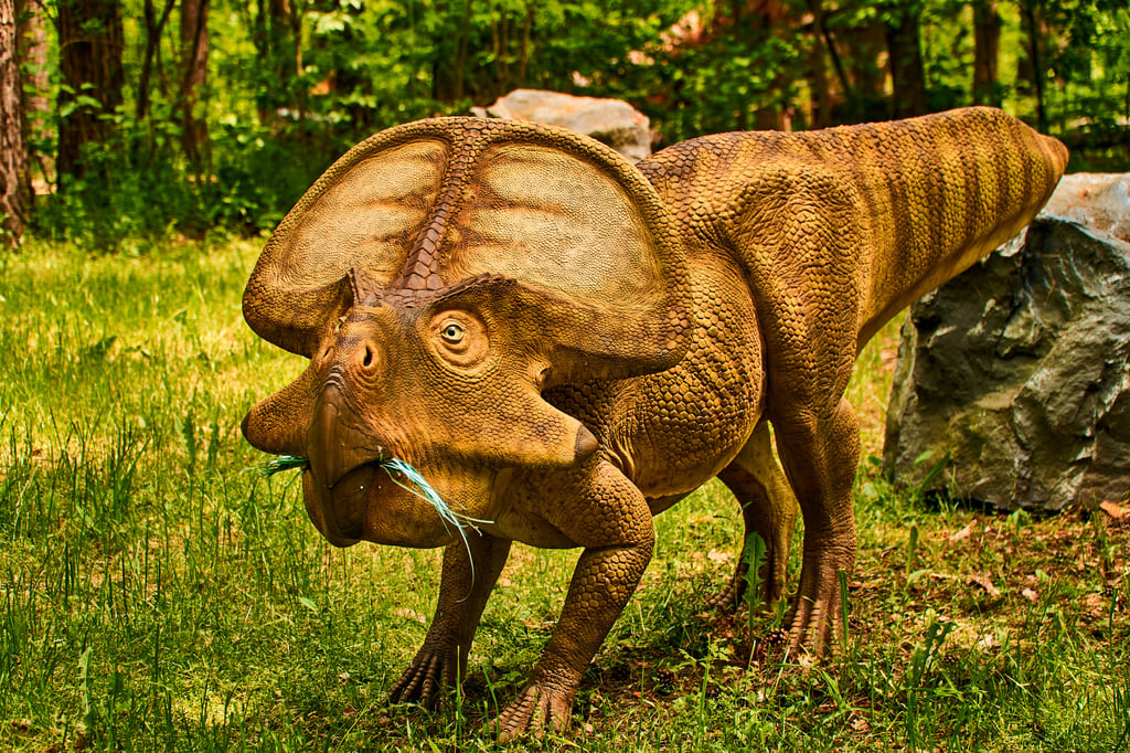研究发现,角龙类恐龙(如图中这只原角龙)在进化成大型生物过程中,智力、听觉和嗅觉均出现退化。图片来源:Shutterstock