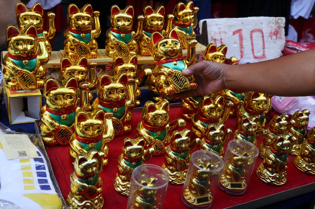 香港油麻地庙街纪念品摊位上出售的招财猫摆件,被普遍认为能为家庭和商铺带来好运。摄影:Edmond So
