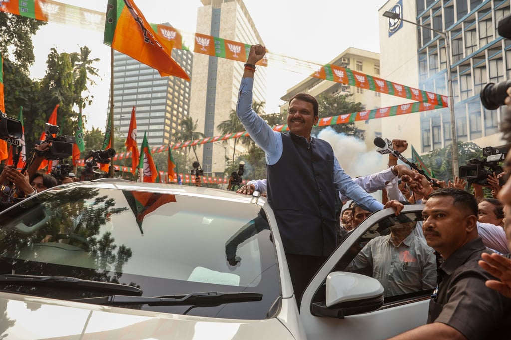 马哈拉施特拉邦首席部长竞争者、印度人民党(BJP)领袖德文德拉·法德纳维斯,于11月23日在孟买的印度人民党总部庆祝赢得马哈拉施特拉邦议会选举多数席位时向支持者挥手致意。照片:EPA-EFE