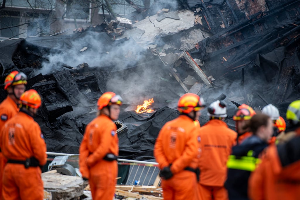 海牙救援人员查看爆炸后燃烧的建筑废墟。图片来源:德新社