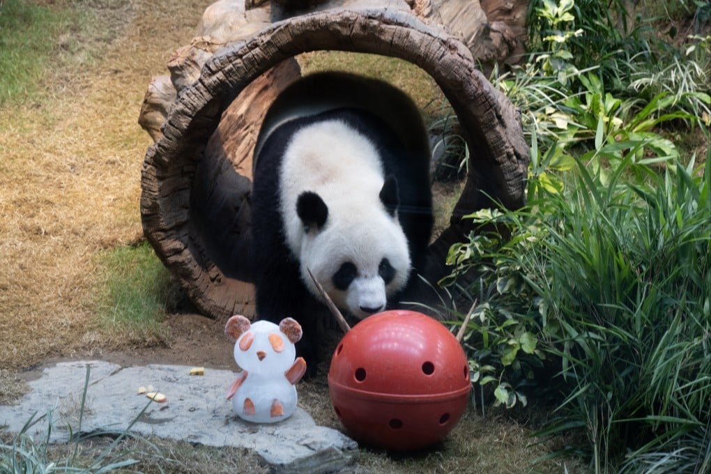 行政长官李家超与夫人林丽婵参观海洋公园"香港赛马会四川奇珍馆”,背景为熊猫佳佳。摄影:Robert Ng