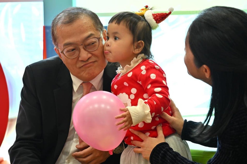 在卫生局社交媒体发布的照片中,如今两岁活泼开朗的赖芷希(音译)在九龙湾香港儿童医院举行的聚会上亲吻了卫生局局长卢宠茂的脸颊。