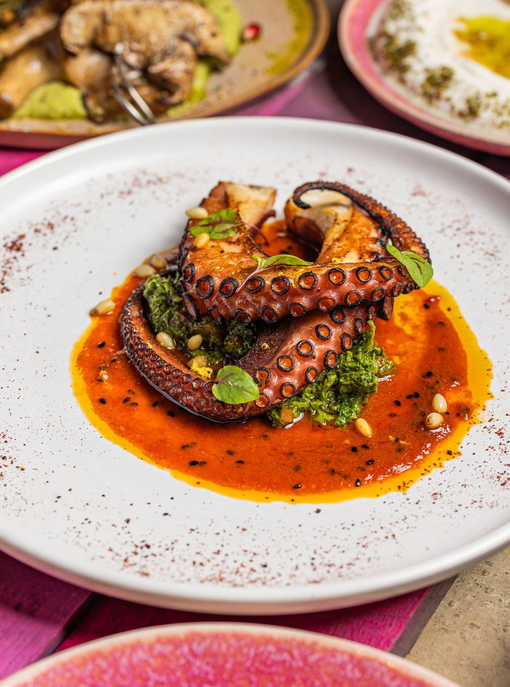 中东餐厅Bedu为庆祝主厨Ali Ahmadpour上任一周年推出新菜单,图中为烤哈里萨章鱼配松子莎莎酱。图片来源:Bedu