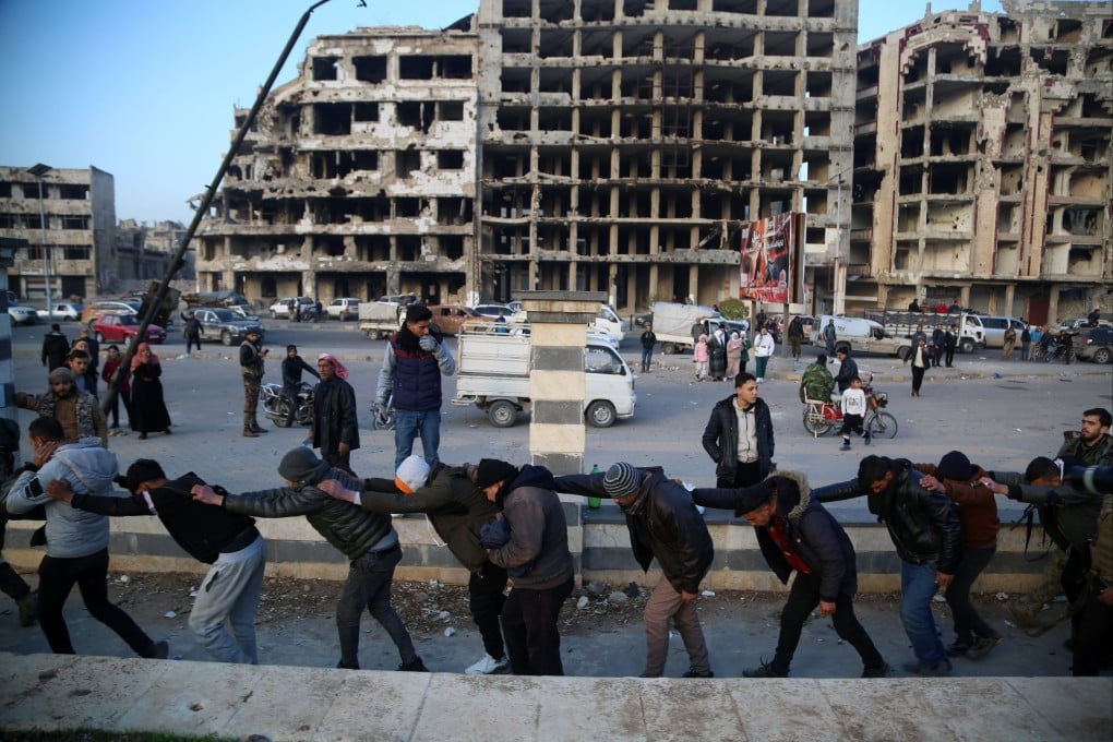 据报道,获释的囚犯们在大马士革的街道上。照片:Nedal Al-Amari via Reuters