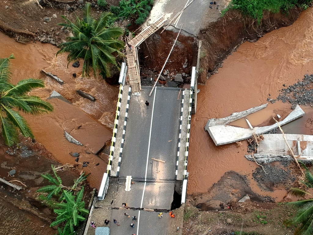 12月9日航拍照片显示,印度尼西亚西爪哇省Cisarakan村一座被洪水冲毁的桥梁。图片来源:新华社