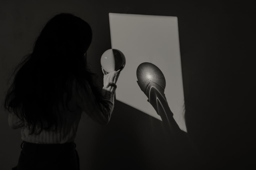 两个装满水的玻璃球体,形似水晶球,是罗西与罗西画廊展出的另一件装置作品《两具身体》的一部分。光线透过旋转在相机三脚架上的球体,呈现出意想不到的视觉画面,展现了光的变幻效果。