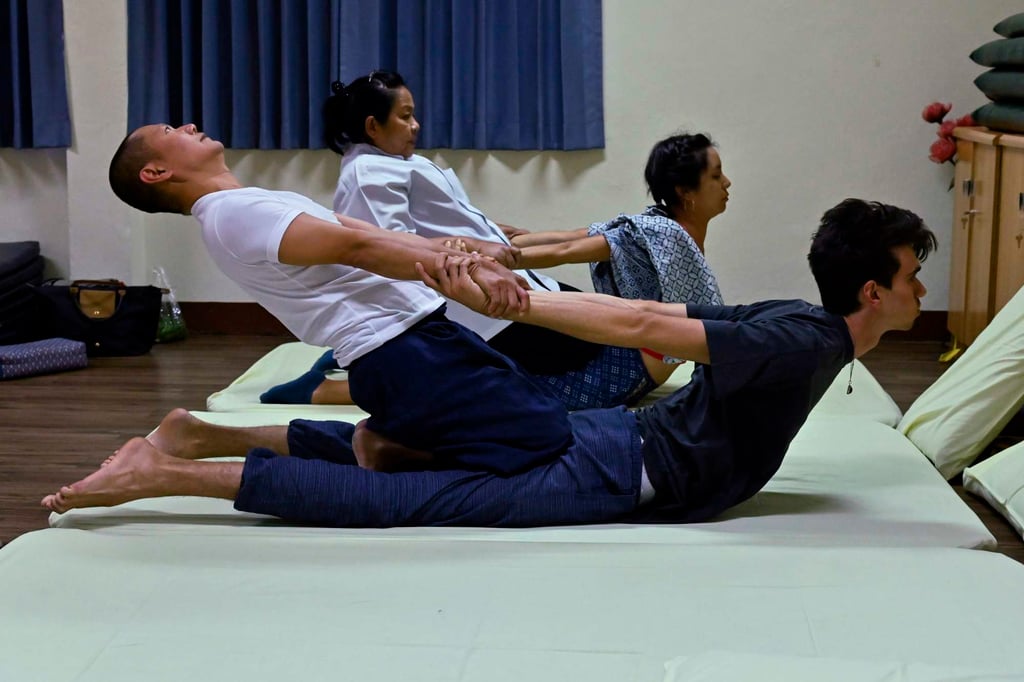 两名外国学员在曼谷一家泰式传统按摩学校接受培训。照片:法新社
