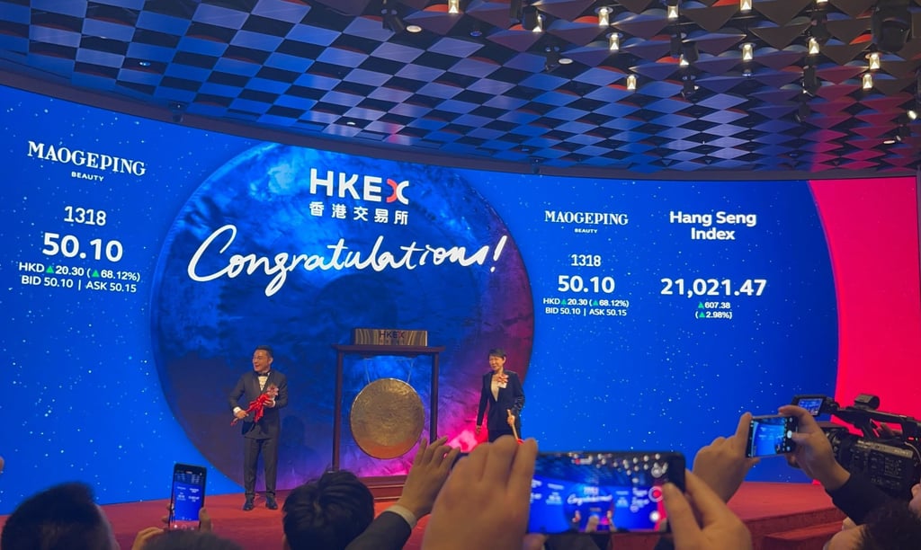 中国美妆企业毛戈平化妆品股份有限公司于周二在港挂牌。摄影:Mia Castagnone
