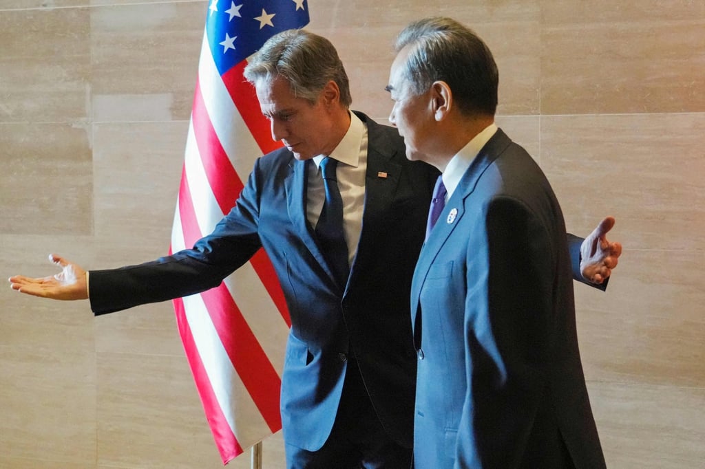 美国国务卿安东尼·布林肯(左)在7月老挝东盟峰会期间与中国外交部长王毅会晤时示意。照片:法新社
