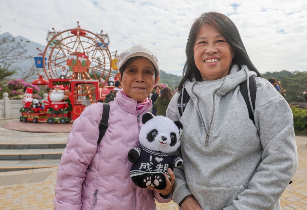 一位何姓女士(左)表示专程从澳门来港一睹熊猫吉祥物风采。摄影:Edmond So