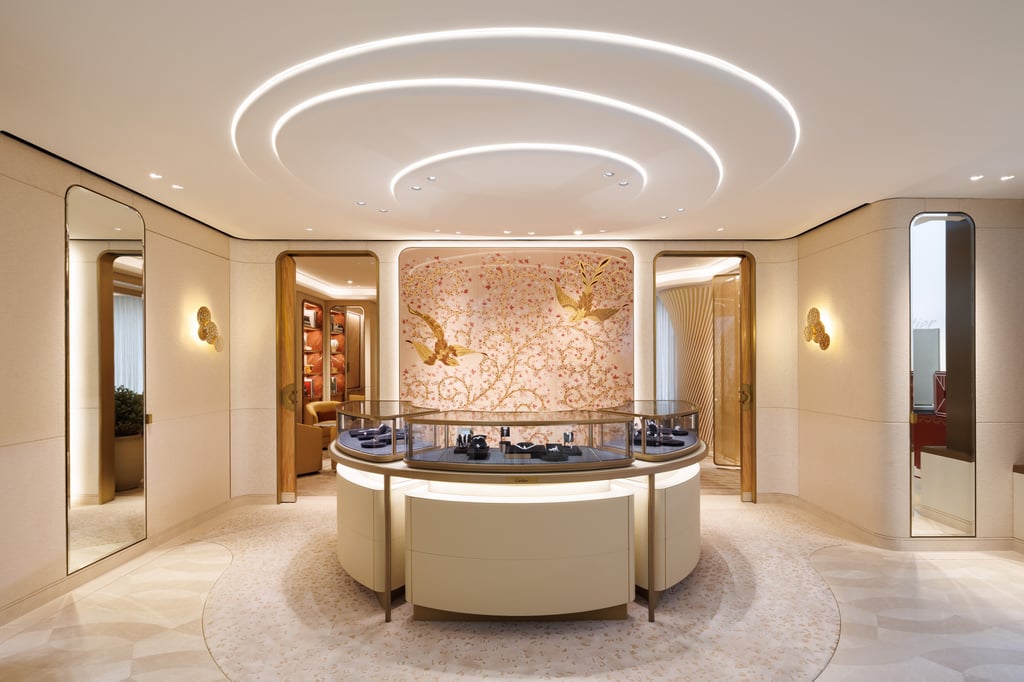 中性及男性宇宙空间再次运用麦秆镶嵌工艺,品牌标志性猎豹图腾以映香江碧波的湛蓝色调傲踞其间。而彰显本地文化另一面的"尊贵宇宙"展区——卡地亚高级珠宝系列的殿堂——则陈列着巴黎Midavaine工作室设计的漆木三联壁画,群鸟环绕生命之树翩跹的图景跃然墙上。