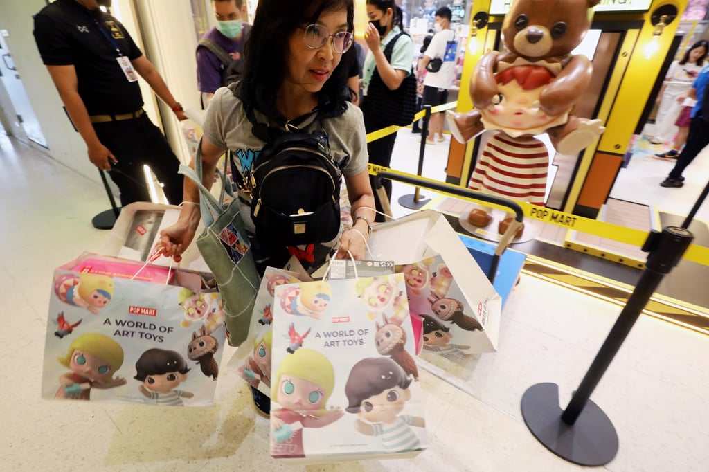 2023年9月20日,一名女子提着多袋从曼谷泡泡玛特购买的玩具产品。图片来源:EPA-EFE