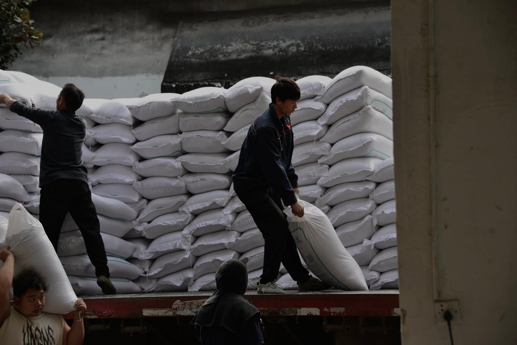 东浦绍兴酒厂的工人们正在搬运用于酿酒的糯米袋。摄影:Evelyn Chen