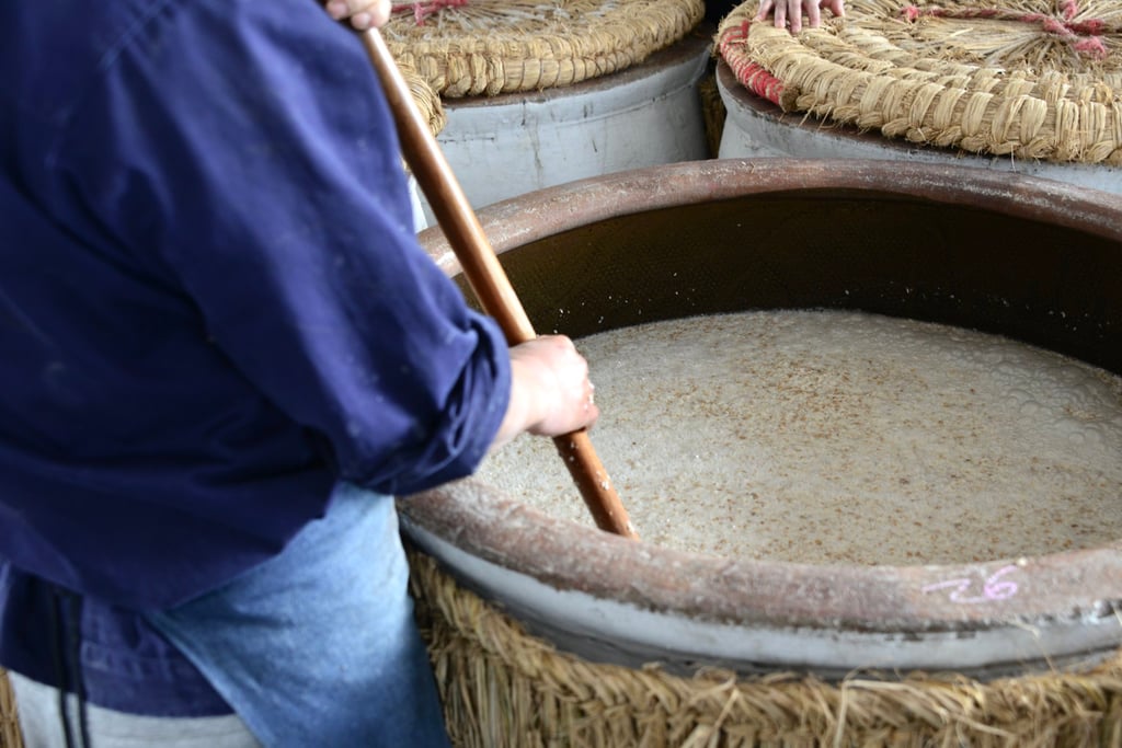 东浦酒厂将鉴湖水与酒曲、大米混合。这种混合物被倒入大缸中冷却的米饭里搅拌,随后静置四天。摄影:Evelyn Chen