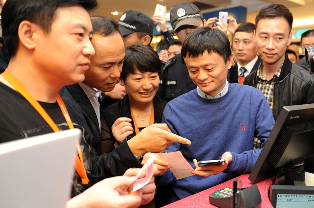 2014年3月31日,阿里巴巴创始人马云(右二)与银泰商业集团董事长沈国军(左二)在杭州银泰百货门店。图:新华社